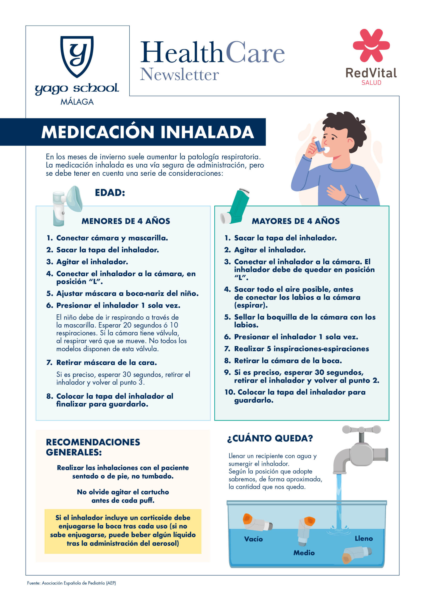 Para facilitaros este proceso, os dejamos a continuación una guía práctica elaborada por nuestra enfermera escolar, donde podréis encontrar de forma visual y sencilla todos los pasos para una correcta administración de la medicación inhalada según la edad. Si tienes alguna duda, contáctanos. ¡Estamos a tu lado!